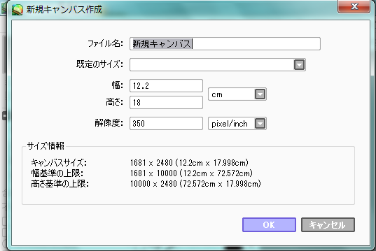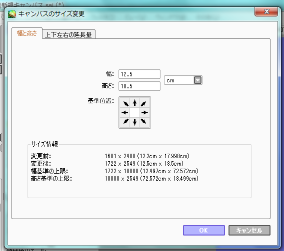 ④キャンパス<キャンパスサイズの変更 で、上記のように幅・高さを変えます。