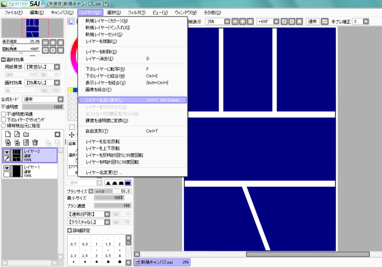 ②キャンパス一面を選択し、レイヤー<レイヤーを塗りつぶす