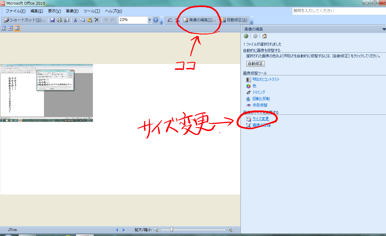 ここではMicrosoft office に入っている、picture managerを使ってサイズ変更します。