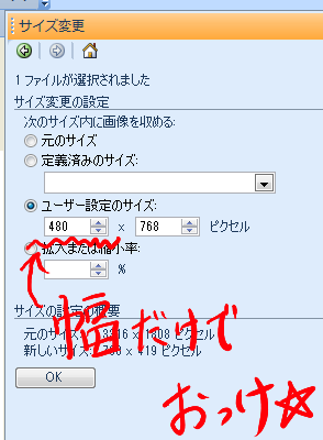 ②「ユーザー指定のサイズ」に上記のように、幅480といれます。